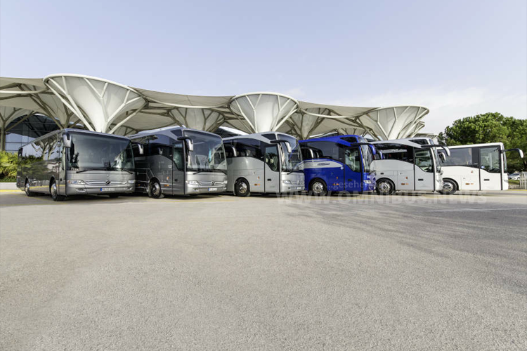 Die Tourismo-Familie im Jahr 2016: Mercedes-Benz Tourismo Range; Tourismo K, Tourismo, Tourismo M, Tourismo L, Tourismo M/2, Tourismo RH (von links). Foto: DaimlerTruck