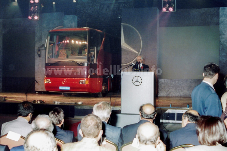 Eröffnungsveranstaltung am 10. Juni 1995: Der damalige Vorstandsvorsitzende der Mercedes-Benz AG, Helmut Werner, präsentiert den Mercedes-Benz O 350 Tourismo. Foto: Schreiber