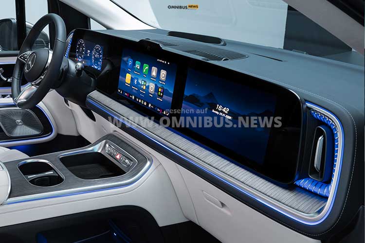 Optional gibt es auch die klassische Dreier-Sitzbank. Auch optional: Ein ausfahrbarer 31,3-Zoll-Panorama-Screen mit 8K-Auflösung klappt bei Bedarf aus dem Dachhimmel. Zusammen mit einem Burmester 3D-Soundsystem (22 Lautsprecher, Dolby Atmos) wird der kleine Benz-Bus zum mobilen Kinosaal, natürlich mit WLAN und HDMI-Schnittstelle. Führend in seiner Klasse? Also doch ein Fahrzeug für das Van-Segment? Noch nie trat ein Transporter von Mercedes-Benz derart selbstbewusst auf, noch nie gab es einen so mächtigen Frontgrill.