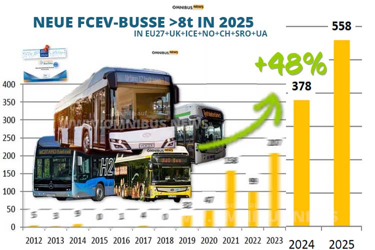 Insgesamt wurden in Europa (EU27 plus UK, ICE, NO, CH, SRO und UA) 558 Brennstoffzellenbusse dieser Klasse neu in Betrieb genommen. Auffällig: 60 Prozent aller neu zugelassenen FCEV-Linienbusse in Europa fahren in Deutschland. Marktführer unter den Herstellern bleibt der polnische Bushersteller Solaris, der zur spanischen CAF-Gruppe gehört. 277 abgesetzte Fahrzeuge bedeuten 2025 einen Marktanteil von 49,6 Prozent – nahezu die Hälfte des europäischen Marktes.
