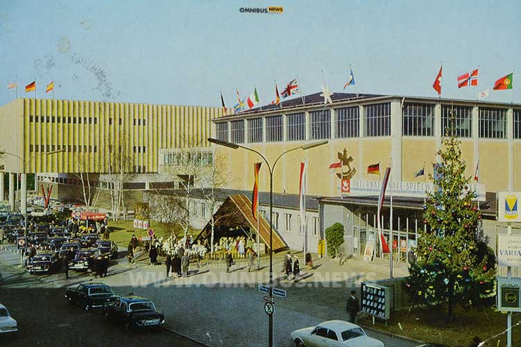 Eine Postkarte aus dem Fundus der Spielwarenmesse zeigt das Messegelände am Stadtpark und den Eingang zur Messehalle im Jahr 1968. Foto: Foto: Spielwarenmesse eG