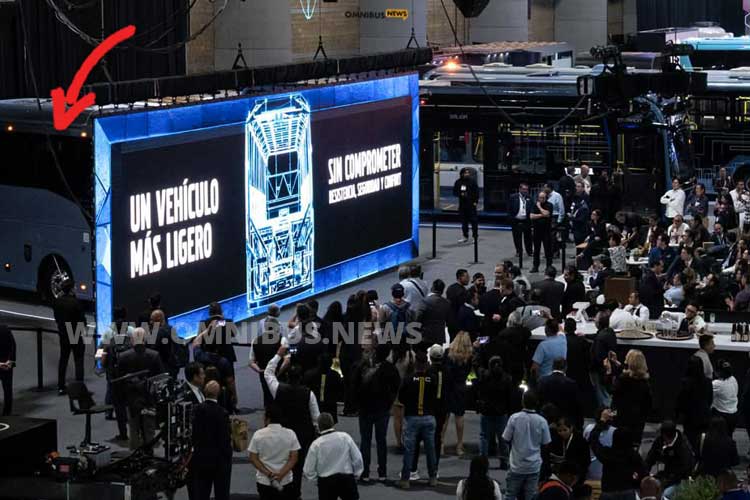 Zurück zum Vorhang bzw. zum „Verstecken“: Zusammen mit der Folie sollte Volvo Buses Mexico Details bis zur offiziellen Vorstellung schützen; gleichzeitig gehört das Aufbauen von Spannung zum Marketing: Ein „Reveal“-Event erzeugt Medienaufmerksamkeit und steigert die Erwartungshaltung bei Kunden. Natürlich darf der Vorhang nicht fehlen; ihn durch eine Leinwand zu ersetzen, ist ein geschickter Zug. Ganz klassisch ein Rear-View-Reveal – aber eines der Jahres 2026, bei dem bei der Vorführung ein Vorhang fällt bzw. eine Leinwand hochgezogen wird. (VolvoBusesMexiko/omnibus.news/Sr)