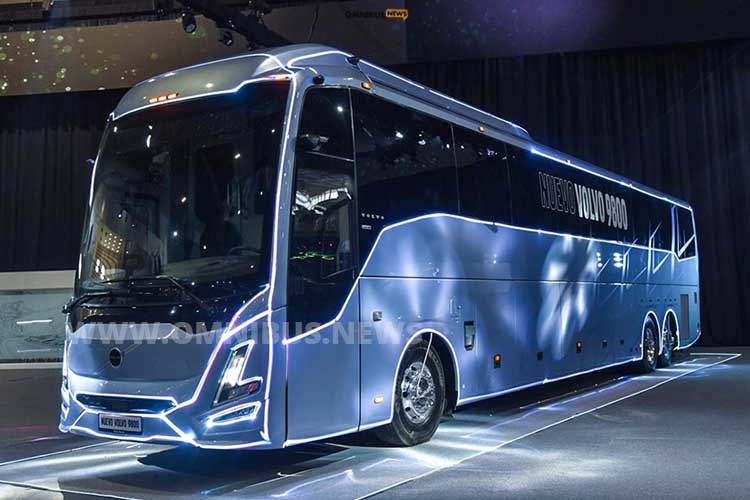 Der überarbeitete Volvo-Reisebus ist schon beim Aufbau des Messestandes etwas Besonderes: Zunächst fehlte der 9800, dann wurde er in die Halle gefahren; Frontmaske, Teile der Seitenwand und des Hecks waren vor neugierigen Blicken unter einer weißen Folie verborgen. Noch war nicht zu erkennen, dass die Karosserie kantiger geformt ist, mit deutlich geschärften Linien. Die bumerangförmigen LED-Tagfahrlichter spiegeln die aktuelle Designsprache der schwedischen Marke wider. Auffällig ist zudem Folgendes, speziell für den mexikanischen Markt entwickelt: