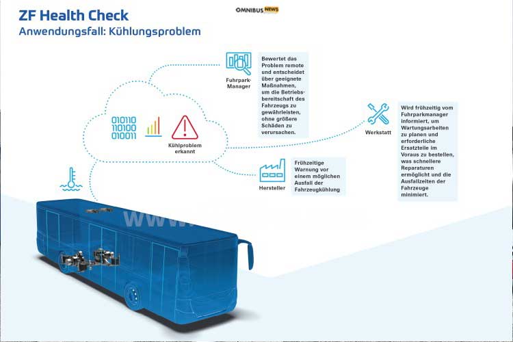 Jetzt erweitert ZF das Angebot an E-Bus-Komponenten und kündigt für die Bus2Bus in Berlin eine neue Software zum Monitoring und zur vorausschauenden Wartung von Antriebssträngen an. Das System werde zunächst mit der elektrischen ZF-Portalachse AxTrax 2 LF kompatibel sein, so ZF. Die Health-Check-Software von ZF analysiert Daten aus dem Antriebsstrang in Echtzeit für Flottenbetreiber und Fahrzeughersteller. Die Softwarelösung ermögliche damit eine vorausschauende Zustandsüberwachung, so der Hersteller.